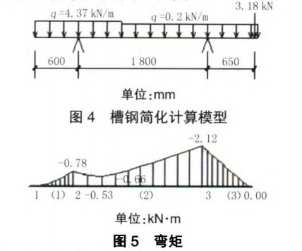 2)18a#槽鋼參數(shù)。截面抵抗141cm3;抗彎強(qiáng)度設(shè)計值205N/m㎡;線載荷0.2kN/m。