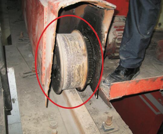 大車走輪齒輪失效。TSG Q7015-2016《起重機械定期檢驗規(guī)則》C4.1 一般要求(1)對各類起重機械的主要零部件(包括吊具、鋼絲繩、滑輪、開式齒輪、車輪、卷筒、環(huán)鏈等),按照有關(guān)安全技術(shù)規(guī)范及其相關(guān)標準檢查磨損、變形、缺損情況。