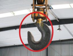 吊鉤防脫鉤裝置缺失。TSG Q7015-2016《起重機械定期檢驗規(guī)則》C4.2吊具 檢查是否符合以下要求:(2)吊鉤設(shè)置防脫鉤裝置(司索人員無法靠近吊鉤的除外),并且有效。